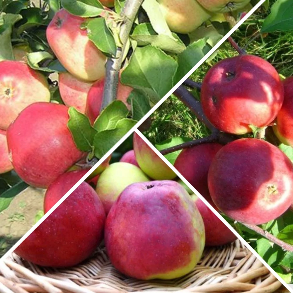 Дерево-сад - многосортовое дерево (на которое привито более 1 сорта) Даёт уникальную возможность получить с одного дерева плоды разной окраски, размера, вкуса и срока созревания. Повысить урожайность за счёт улучшения опыления благодаря близкому расположению разных сортов, сэкономить место на Вашем участке. Лобо - Зимнего срока потребления. Дерево высокорослое. Крона широкоокруглая, редкая. Плодоносит на кольчатках, а также на плодовых прутиках. Плоды средней и выше средней величины, массой 130 г, максимум - 200 г, от плоскоокруглой до плоскоокруглой конической формы, слаборебристые. Кожица гладкая, блестящая, плотная, с сизым восковым налетом. Основная окраска желтовато-зеленая, почти полностью покрыта полосатым, размытым мраморовидным, нарядным, малиново-красным румянцем. Подкожные точки многочисленные, крупные, белые, хорошо заметные по всей поверхности плода. Мякоть белая, нежная, сочная, мелкозернистая. Вкус очень хороший, кисло-сладкий. Плоды хранятся 4 месяца. Урожайность ежегодная. Столовый. Зимостойкий. Кандиль Орловский - Зимнего срока потребления. Дерево среднерастущее с округлой пониклой кроной. Плоды средние, массой 135 г, одномерные, продолговато-конические, сильноребристые, скошенные у вершины. Окраска светло-желтая с малиновым размытым румянцем. Вкус кисло-сладкий со слабым ароматом. Хранятся до февраля. Оценка вкуса 4,5 балла. Сорт иммунный, плоды высоких товарных качеств. Зимостойкость высокая. Спартан - Позднезимнего срока потребления, плоды хранятся до апреля. Плоды при созревании не осыпаются. Урожайность выше средней. Скороплодность высокая. Столовый. Дерево среднерослое. Крона округлая, не густая. Плоды ниже средней и средней величины, 90 г, максимум 120 г, округлой или округло-конической формы, слабо широко ребристые. Кожица светло-желтая с интенсивным бордово-красным румянцем и сильным сизым восковым налетом почти на всей поверхности плода. Мякоть белая, плотная, колющаяся, сочная, ароматная. Вкус очень хороший, сладкий.