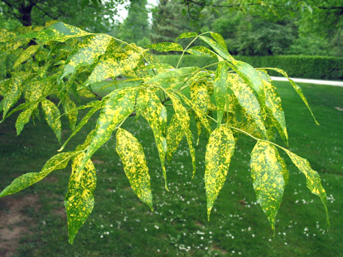 Удивительно красивая расцветка листьев отличает крупный и быстрорастущий сорт ясеня пенсильванского Аукубифолия: длинные зеленые листья украшены большим количеством кремовых и золотистых пятен, вкраплений и полос, которые делают их пестрыми и яркими.